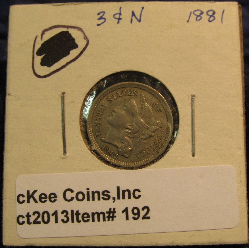 192. 1881 U.S. Three Cent Nickel. VF 20. Redbook value $28.00.