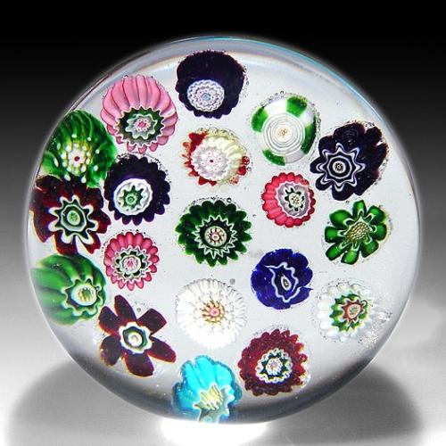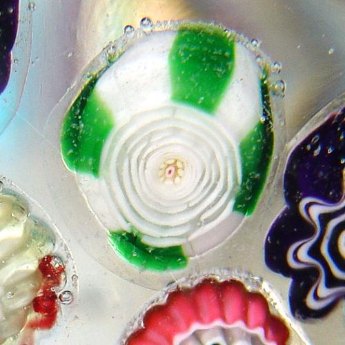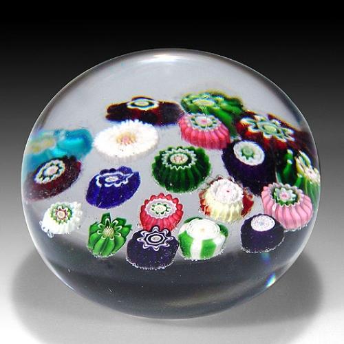 Antique Clichy spaced millefiori paperweight, with assorted complex canes, in pink, green, turquoise, cobalt blue, purple, maroon and white, on clear ground. Includes one white and green rose cane. Diameter 2 1/2". NO RESERVE