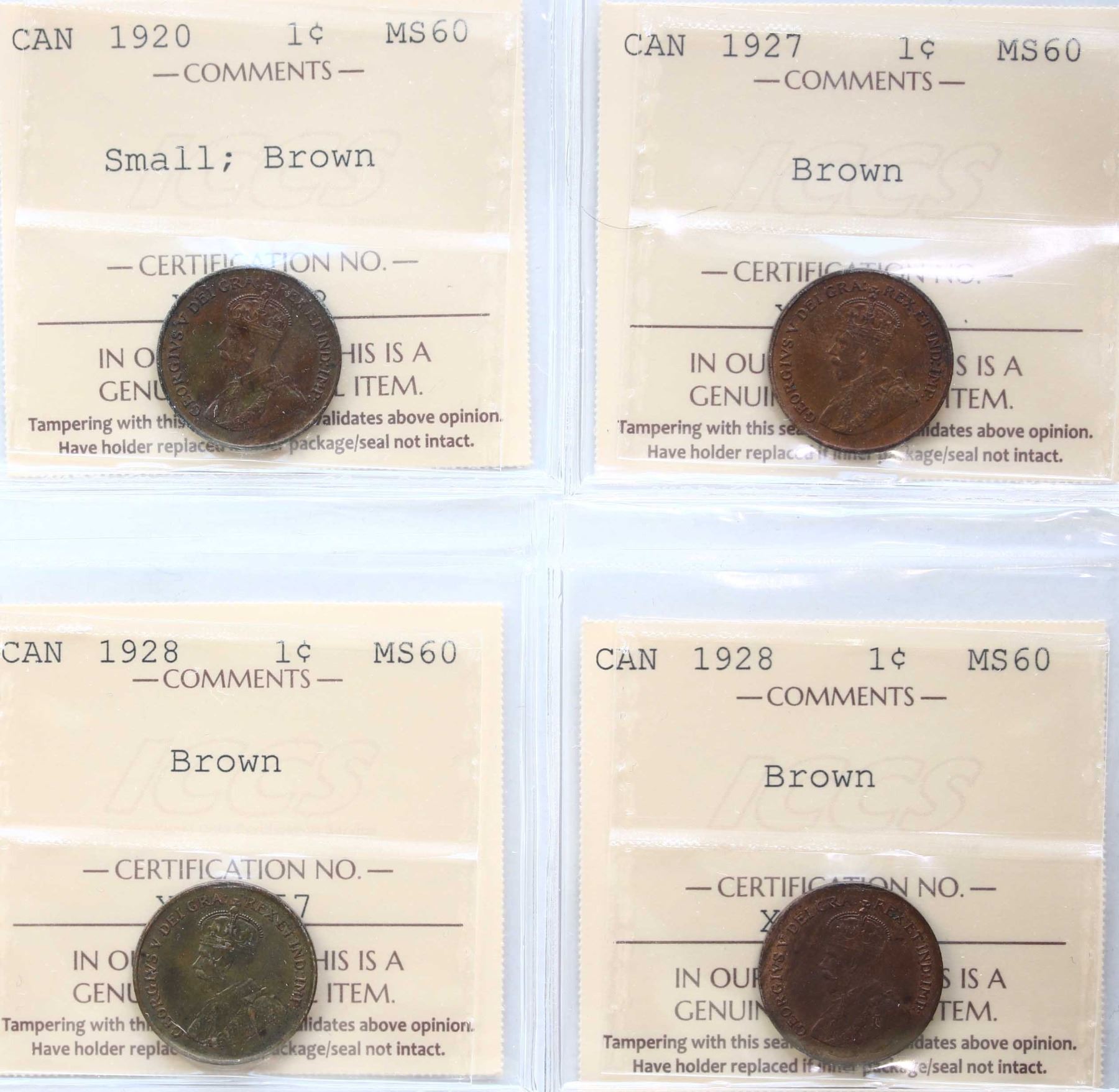 1920 1¢, 1927, 1928 (2), All 4 coins ICCS Mint State-60.