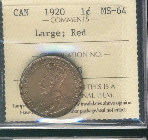 1920 1¢ Lg ICCS MS64RD. 70% red with intense luster and rim tone.