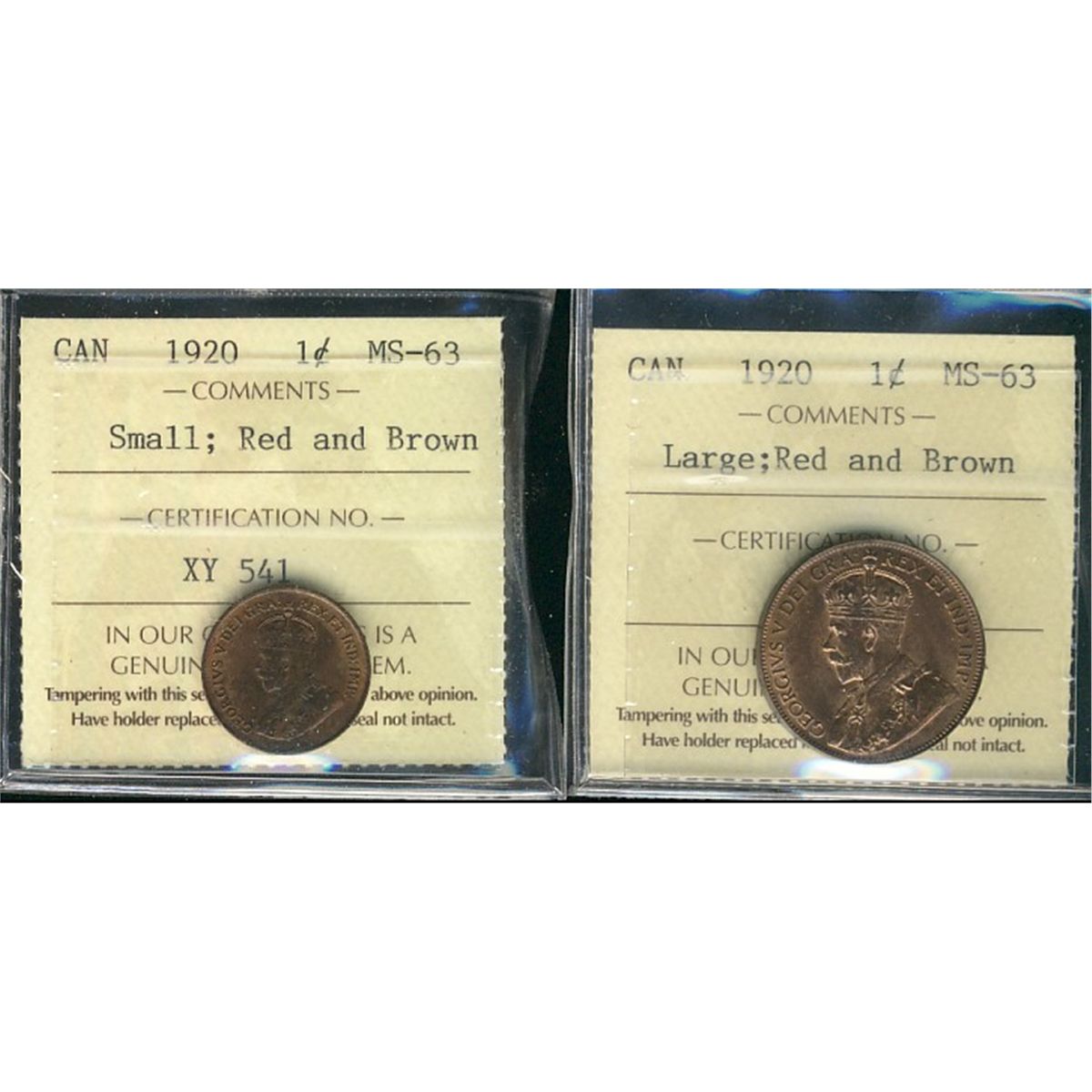 1920 1¢ Lg & Sml ICCS MS63RB. Lot of 2 coins.