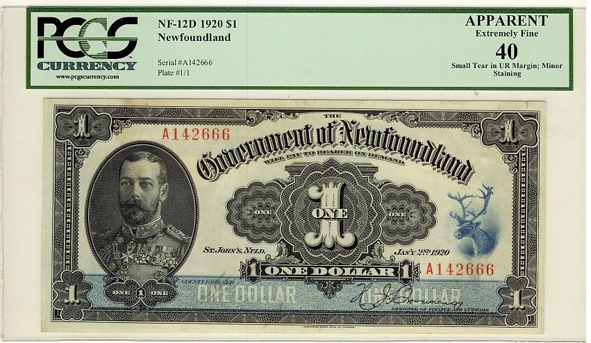 1920 $1 NF-12d Nfld Gov note #A142666, PCGS App EF40 Small tear in UR Margin; Minor Staining. Very scarce this nice.
