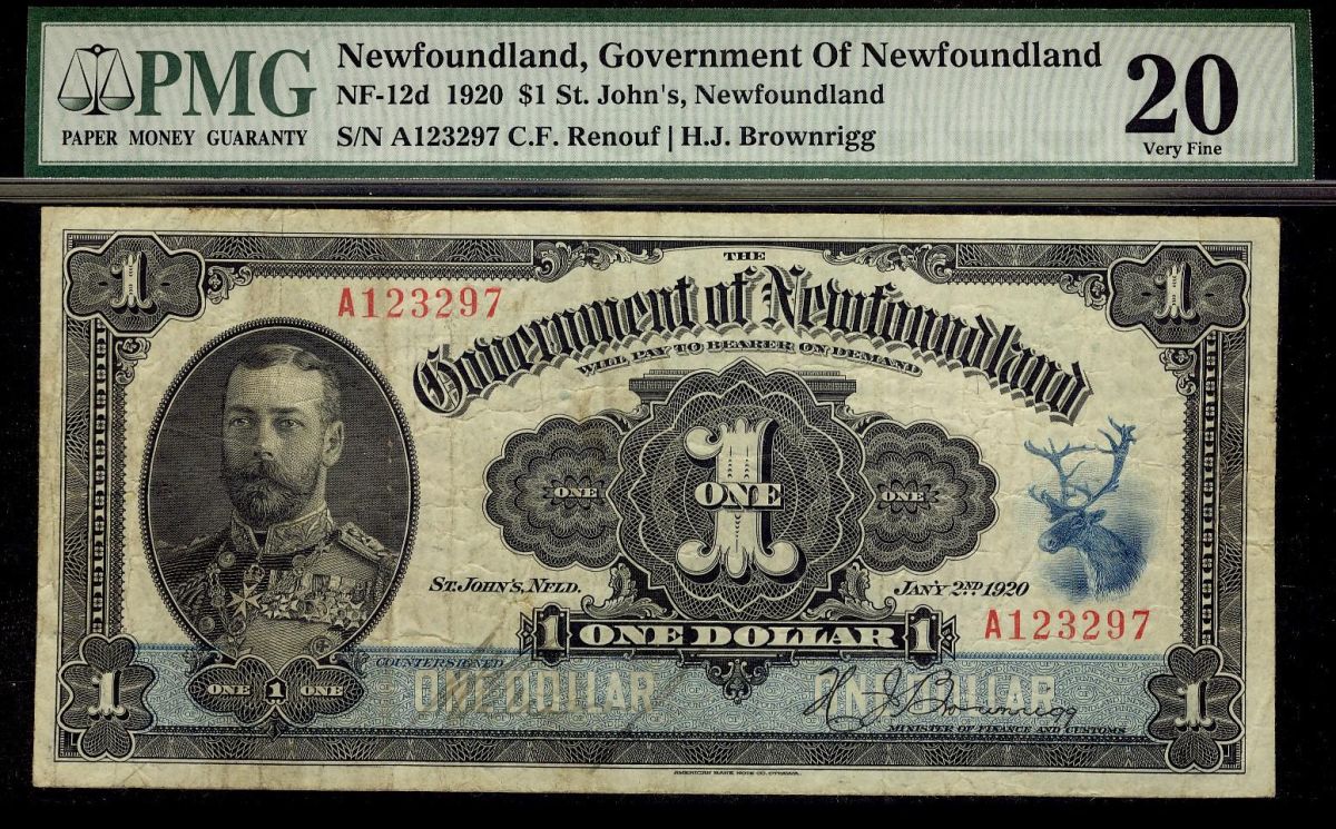 1920 $1 NF-12d Nfld Gov't note #A123297, PMG VF20.