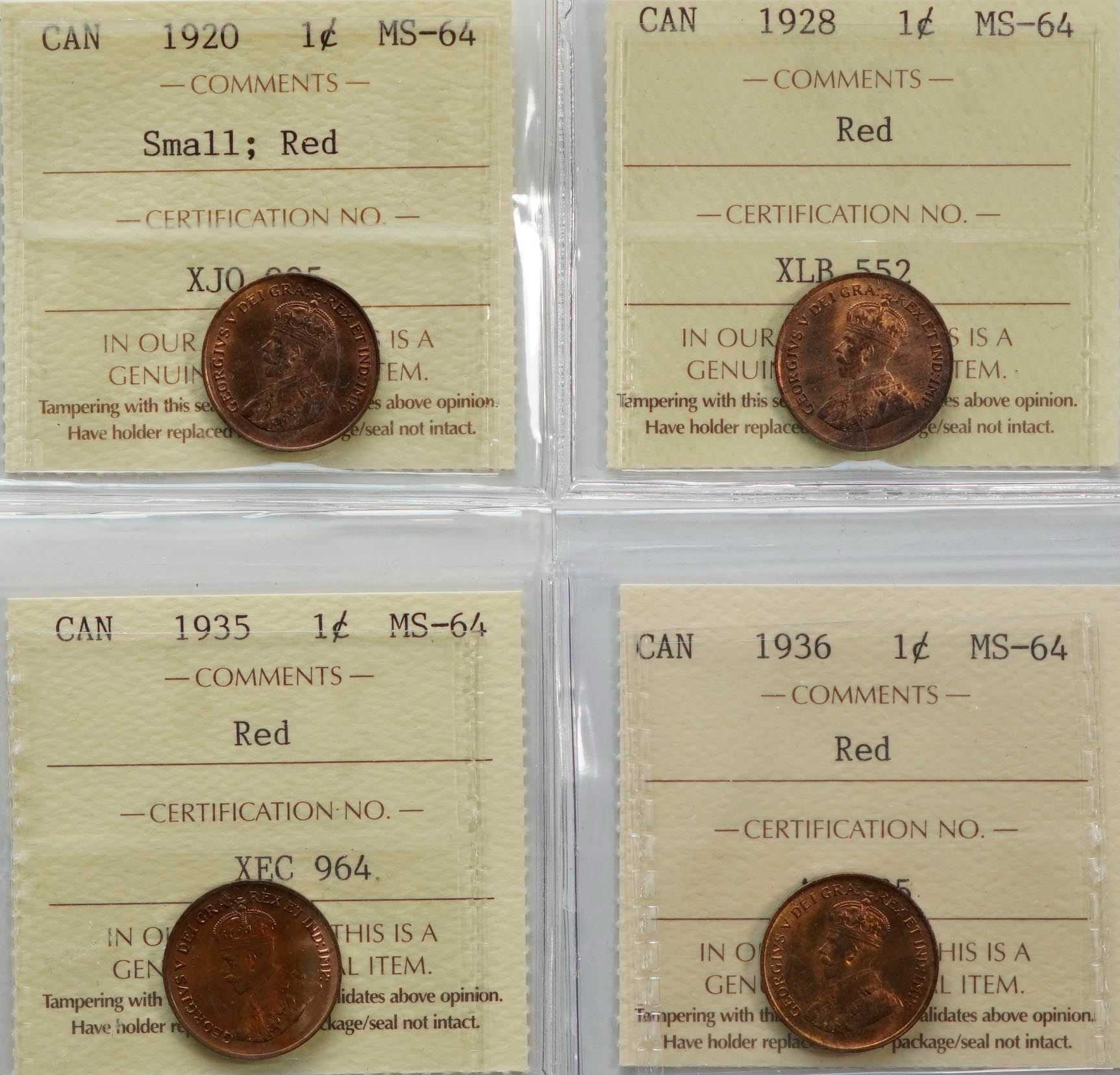1920 1¢ Small, 1928, 1935, and 1936, all ICCS Choice Mint State-64RED, lot of 4 coins.
