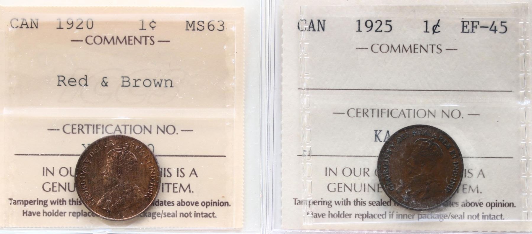 1920 1¢ "Small" ICCS Choice Mint State-63 RB, 1925 ICCS Choice Extra Fine-45, Lot of 2 coins.