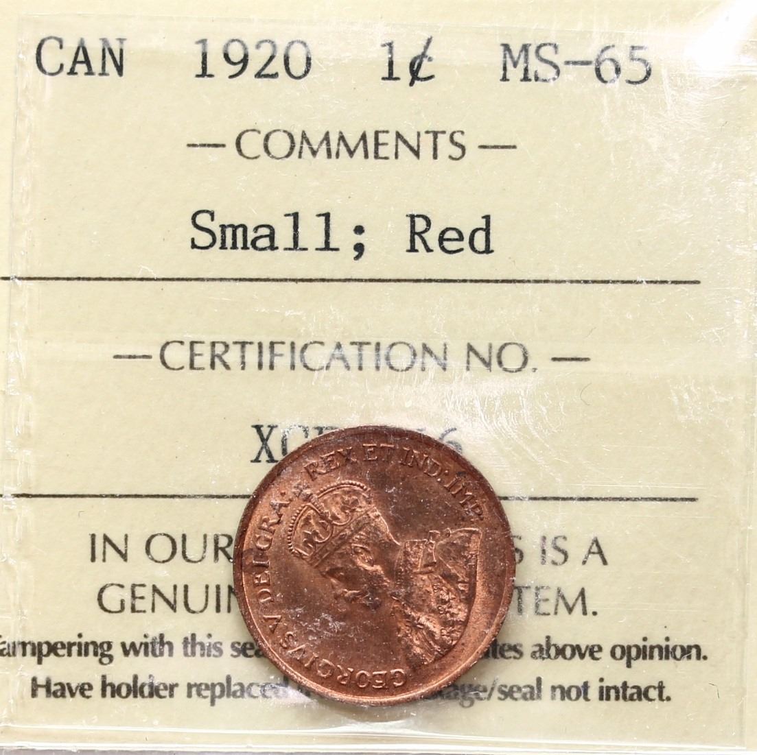 1920 1¢ "Small" ICCS Gem Mint State-65 Red. Full lustre with superb surfaces. A very flashy example!