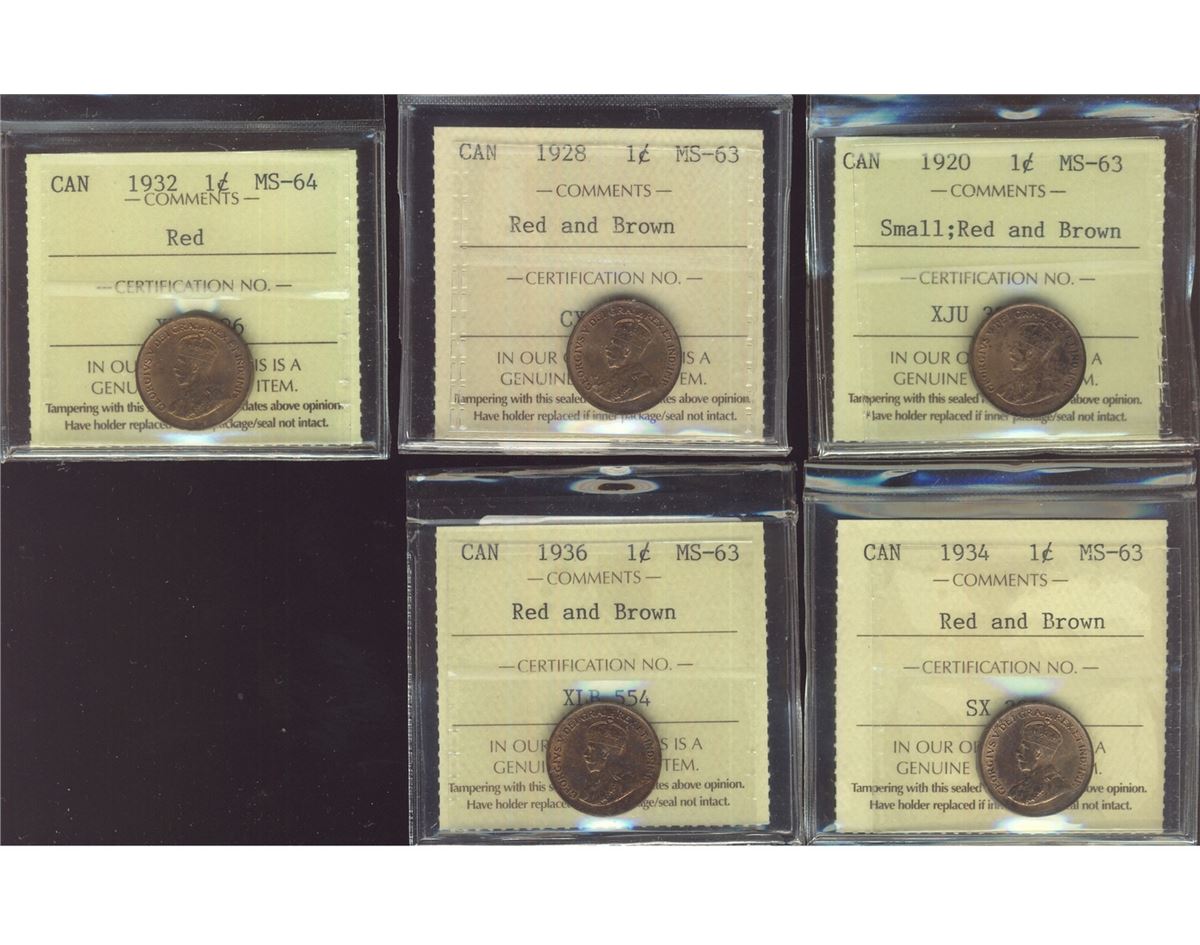 1920 1¢ Sml, 1928, 1932, 1934 & 1936 all ICCS MS63RB. Nice lo of 5 pcs.