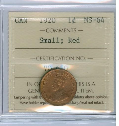 1920 1¢ Sml ICCS MS64 RED, 90% RED LUSTRE.