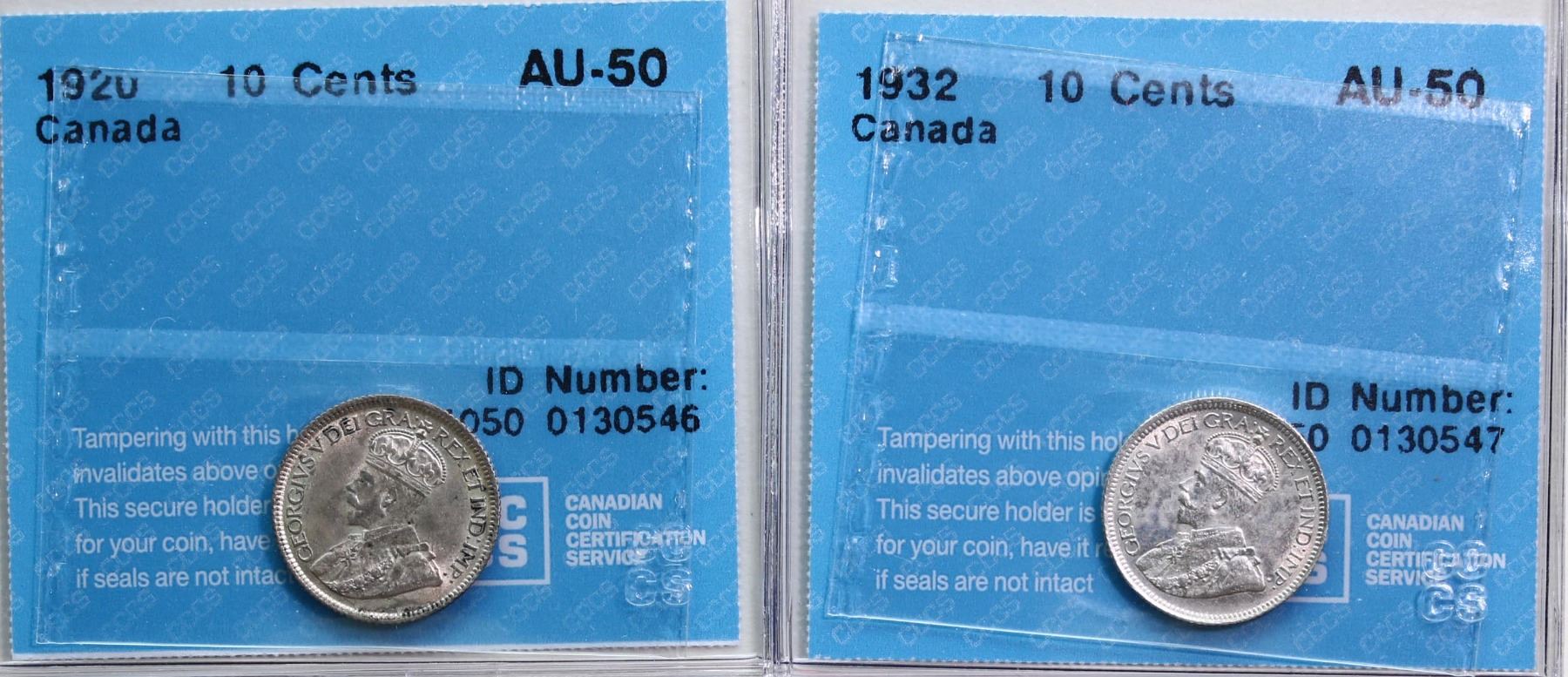 1920 10¢, 1932 Both coins CCCS About Uncirculated-50