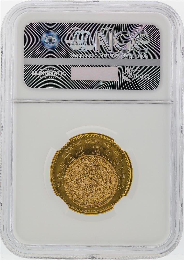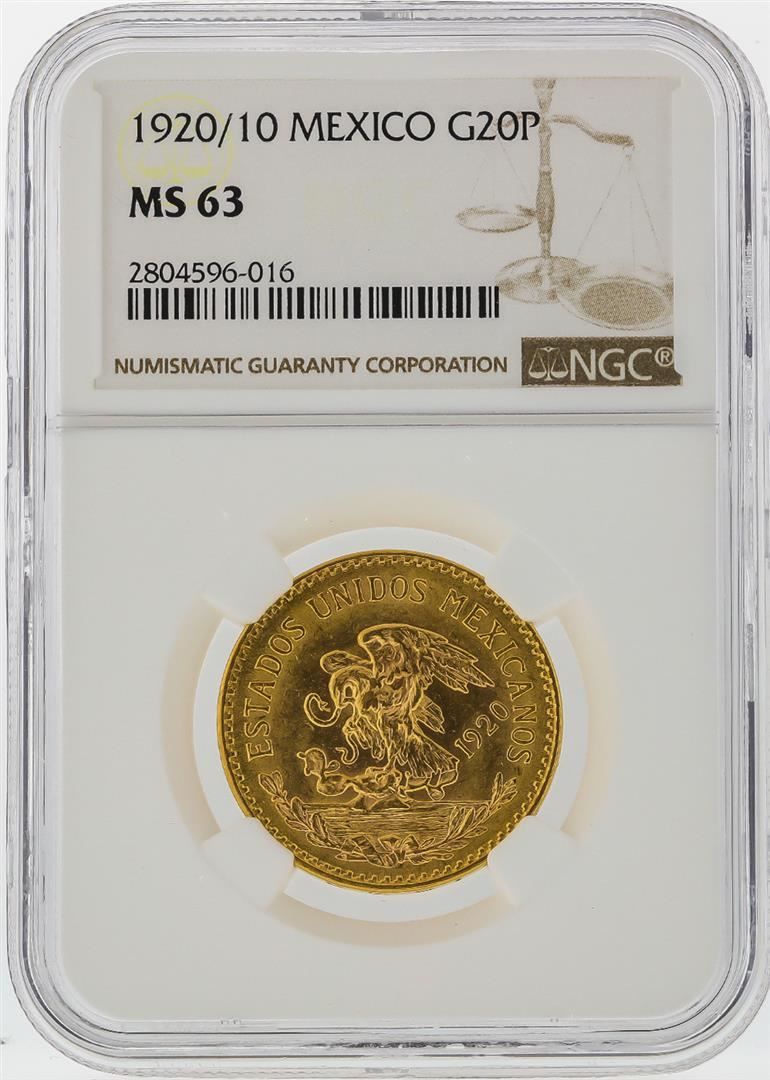 One 1920/10 20 Pesos Mexico Gold Coin NGC Graded MS63. NGC Certified.