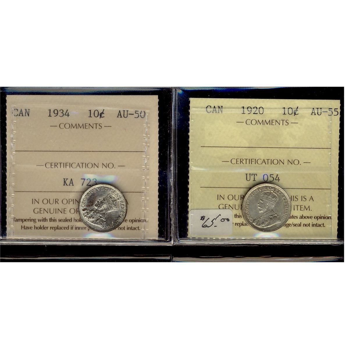 1920 10¢ AU55 & 1934 AU50. Lot of 2 ICCS graded coins.
