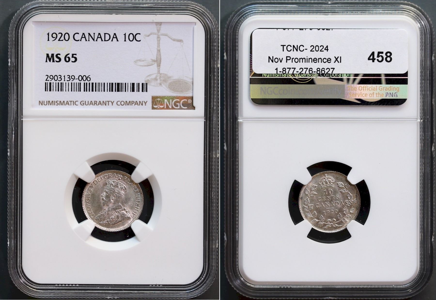 1920 10¢ NGC Gem Mint State-65. Deep rustic tones.