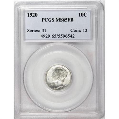<B>1920 10C MS65 Full Bands PCGS.</B></I> PCGS Population (176/88). NGC Census: (100/43). Mintage: 59,030,000. Numismedia Wsl. Price for NGC/PCGS coin in MS65: $440. (#4929)<BR><BR><B>Coin Engraver:</B> Adolph A. Weinman<BR><BR><b>Shipping:</b> Coins & Currency (<a target="_blank" href="http://www.heritageauctions.com/common/shipping.php">view shipping information</a>)