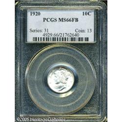 <B>1920 10C MS66 Full Bands PCGS.</B></I> Bright lustrous surfaces are virtually untoned. The design features are well impressed. A tiny mark on mercury's neck, and a couple of more in the right reverse field are mentioned for accuracy. Population: 52 in 66, 6 finer (1/05). Lot:6353