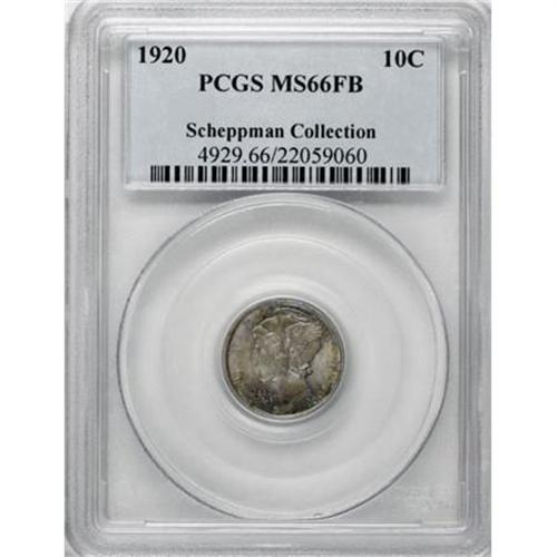 <B>1920 10C MS66 Full Bands PCGS.</B></I> Ex: Larry Shapiro. Toned with iridescent peripheral hues that lighten at the centers to dusky gold. Excellent quality and surfaces combine with boldly defined devices for spectacular visual appeal.<BR><I>From The Scheppman Collection, #4 PCGS Registry of Full Band Mercury Dimes.</B></I><BR><BR><B>Coin Engraver:</B> Adolph A. Weinman<BR><BR><b>Shipping:</b> Coins & Currency (<a target="_blank" href="http://www.heritageauctions.com/common/shipping.php">view shipping information</a>)