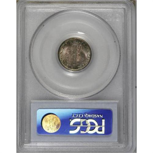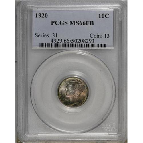 <B>1920 10C MS66 Full Bands PCGS.</B></I> This 1920 Mercury displays a melange of lovely yellow-gold, green, magenta, lavender, and sky-blue patination overlying lustrous surfaces. The design features are well impressed, yielding Full Bands on the fasces. Contact is minimal, as expected of the grade. Population: 76 in 66 Full Bands, 13 finer (2/08).<BR><BR><B>Coin Engraver:</B> Adolph A. Weinman<BR><BR><b>Shipping:</b> Coins & Currency (<a target="_blank" href="http://www.heritageauctions.com/common/shipping.php">view shipping information</a>)