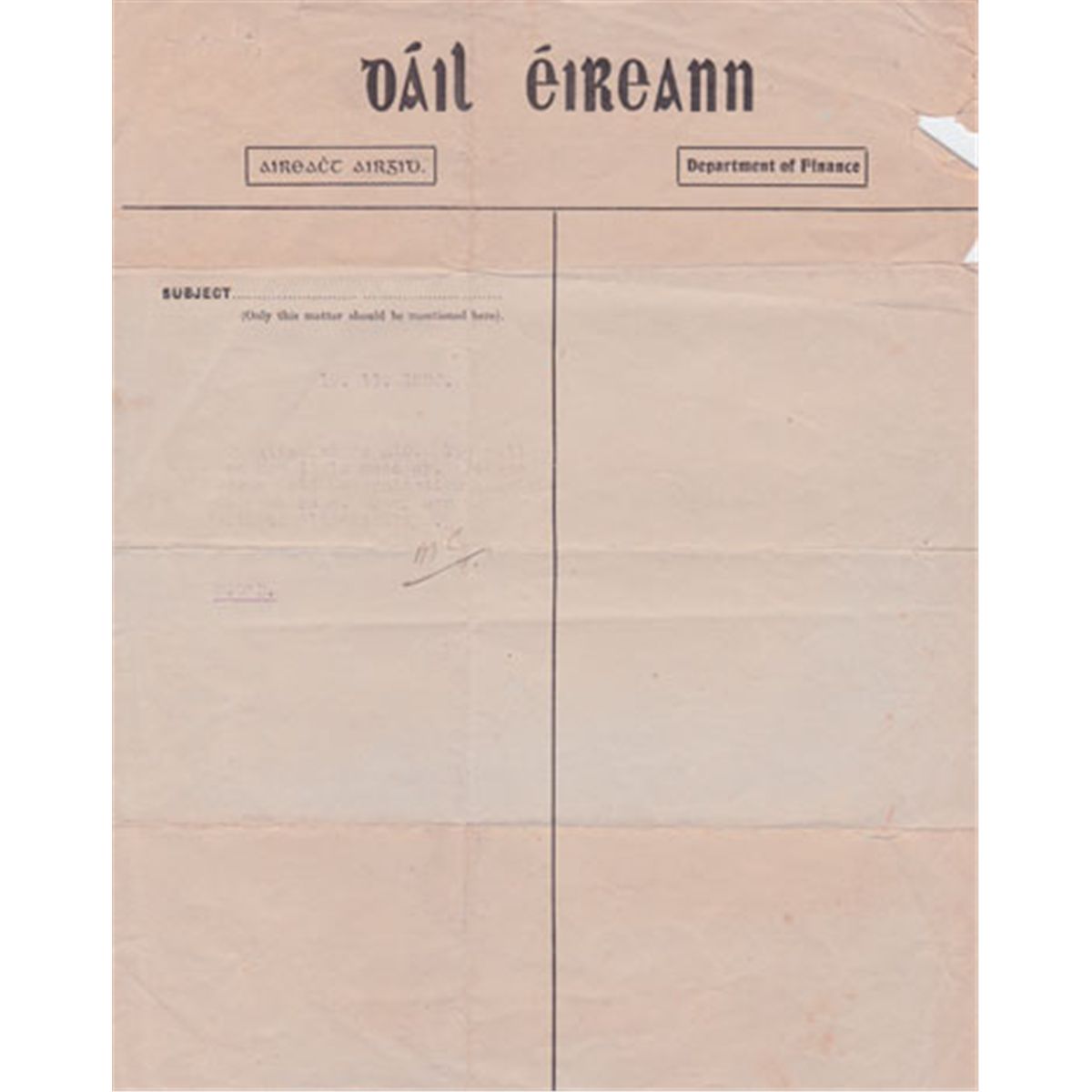 1920 (19 November) Dail Eireann memo signed two days before Bloody Sunday with initials, Michael Collins 1920 (19 November) Dail Éireann Department of Finance memo signed, with initials, Michael Col
