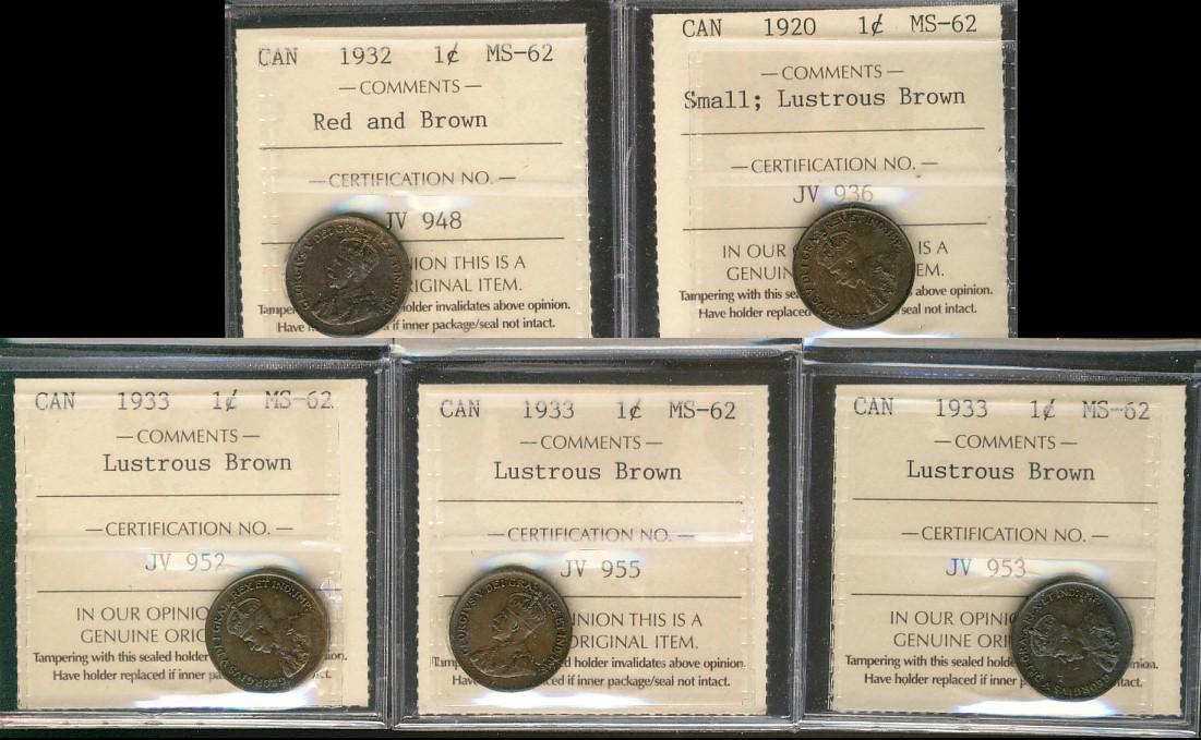 1920, 1932 & 1933(3) 1¢ ICCS MS62. Lot of 5 coins lustrous brown to RB.