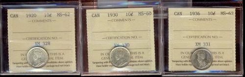 1920-1936 10¢, Lot of three coins all ICCS, includes 1920 MS62, 1930 MS60 & 1936 MS62. All ice attractive examples.