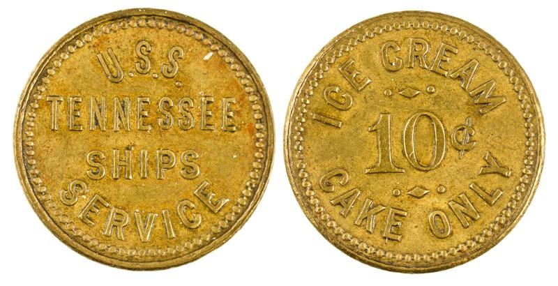 U.S.S. Tennessee, 1920-1959, a battleship which was present when the Japanese attacked Pearl Harbor, docked next to the U.S.S. Arizona. After repairs went to the Aleutians area to protect American Territory, also very active in Pacific naval operations. This battleship matches the Ship service on the token which was used during World War II.