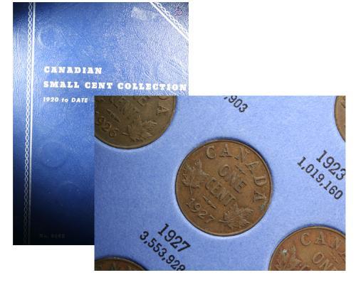 Complete 50 piece small cent collection including the key dates 1922,1923 & 1925 (missing the 1949 A to denticles, 1954 NSF & 1955 NSF). Better than average starter set in blue Whitman folder. Most of the George V coins are Fine or better with the Elizab