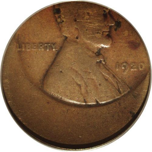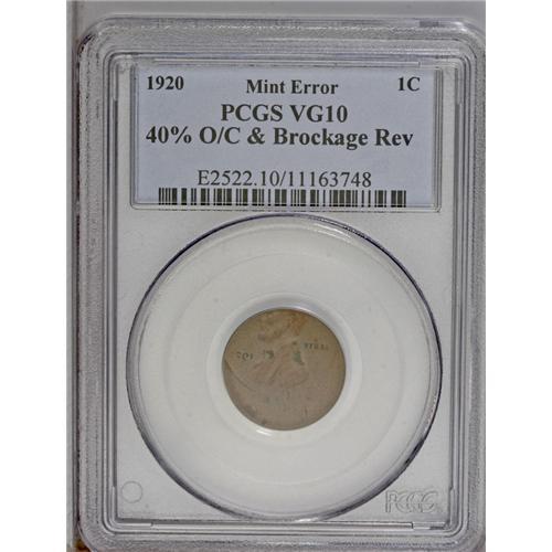 <B>1920<1C> Lincoln Cent--Brockage Reverse, Struck 40% Off Center--VG10 PCGS.</B></I> Instead of being ejected after its strike, a 1920 cent (not the present piece) clung to the reverse die. It likely also blocked the collar die. A new planchet (the present piece) was then fed off-center (at 2 o'clock) between the dies, and was struck by the obverse die and the obverse of the previously struck cent. The reverse of this lot would be a perfect brockage, except it is widely off center, and was presumably carried as a pocket piece by its fortunate finder. An attractive medium brown off center brockage with a few minor specks of verdigris.