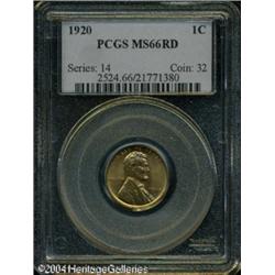 1920 1C MS66 Red PCGS. Lustrous surfaces display a <B>1920 1C MS66 Red PCGS.</B></I> Lustrous surfaces display a coppery-brass color, and a re devoid of any mentionable abrasions. The design elements are crisply struck throughout. Population: 77 in 66, 5 finer (11/04). <BR><BR><B>Important notice:</B> Heritage usually auctions material at the rate of 200-250 lots per hour. On some occasions eBay Live bid software or the Internet may not be able to keep up with the pace of the auction. We recommend placing a realistic absentee bid now as insurance to avoid disappointment. Occasionally the auctioneer may eliminate or reject an eBay Live bid, and the auctioneer may also reopen a lot after the close of the eBay live bidding (usually because we missed an audience bid), and may reject your bid even if it shows you as the winning bidder. By bidding via eBay Live, you agree that Heritage may award the lot to another bidder at its sole discretion under the circumstances described above or any other reasonable circumstances. Since eBay bids are not shown to us until we open the lot on the floor, we treat those bids just like floor bids. In most cases the floor responds before the eBay bid is presented to us, due to Internet lag time, so for consistency we have made it a policy that floor bids are always considered first over tie eBay live bids. Also please note that all Heritage lots purchased through eBay Live carry a 20% Buyer's Premium. Please make sure you read the Terms and Conditions before you bid. This lot is being auctioned in conjunction with a live floor auction by Heritage Galleries & Auctioneers. All final auction and invoice information will be supplied by Heritage Galleries & Auctioneers, and all other information should be considered preliminary. Lot:5283