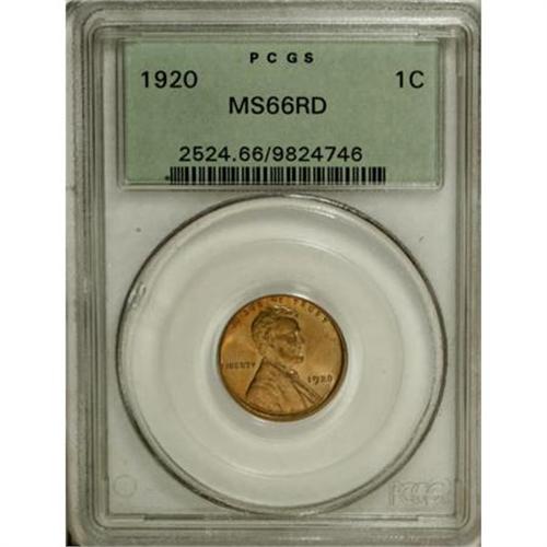 <B>1920 1C MS66 Red PCGS.</B></I> An outstanding Premium Gem that boasts an exceptional strike and vivacious luster. The obverse die was misaligned slightly, and caused a wide rim along the lower obverse border while the rim near 12 o'clock is unusually narrow. In a green label holder.<BR><BR><B>Coin Engraver:</B> Victor D. Brenner<BR><BR><b>Shipping:</b> Coins & Currency (<a target="_blank" href="http://www.heritageauctions.com/common/shipping.php">view shipping information</a>)