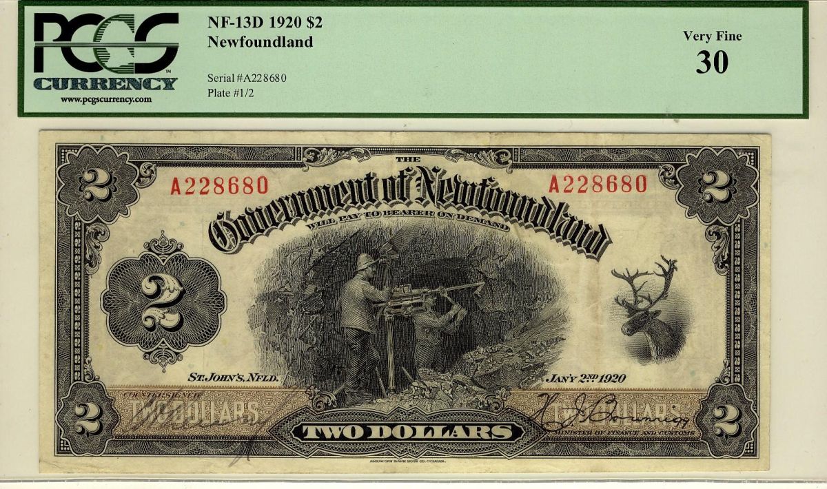1920 $2 NF-13d Nfld Gov note #A228680, PCGS VF30