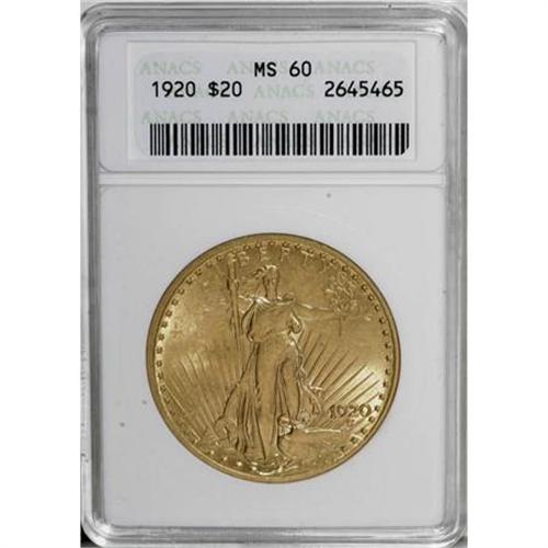 <B>1920 $20 MS60 ANACS.</B></I> NGC Census: (119/4587). PCGS Population (133/3758). Mintage: 228,250. Numismedia Wsl. Price for NGC/PCGS coin in MS60: $695. (#9170)<BR><BR><B>Coin Engraver:</B> Augustus Saint-Gaudens<BR><BR><b>Shipping:</b> Coins & Currency (<a target="_blank" href="http://www.heritageauctions.com/common/shipping.php">view shipping information</a>\)