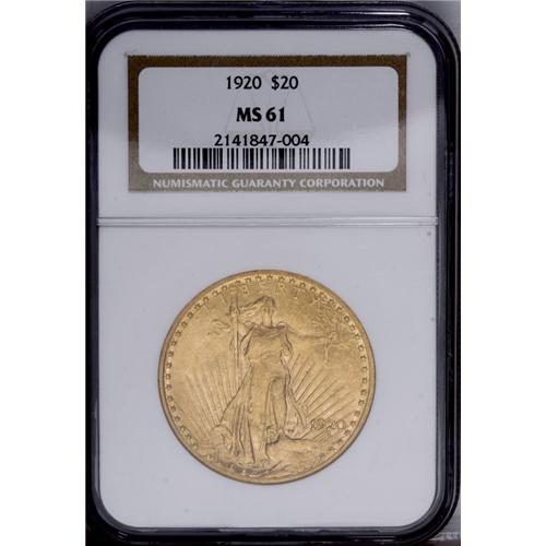 <B>1920<$20> MS61 NGC.</B></I> Somewhat subdued surfaces exhibit honey-gold patination and adequately struck design features. Several light handling marks are scattered over each side.