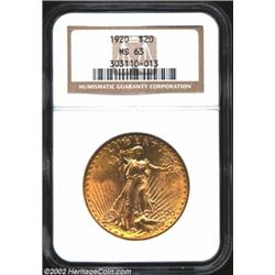 1920 $20 MS63 NGC. Variegated orange-gold colors dance across lustrous, sharp looking features. A moderate scrape in the upper right obverse field is all that seems to stand between this coin and a near-Gem designation. Important notice: We expect to be auctioning lots at the rate of 200-250 per hour. Sometimes eBay Premier live bid software cannot keep up with that pace, so we strongly recommend that you place a realistic proxy bid now as insurance to avoid disappointment. Also please note that all Heritage/CAA lots purchased through eBay Premier carry a 20% Buyer's Premium. Please make sure you read the Terms and Conditions.