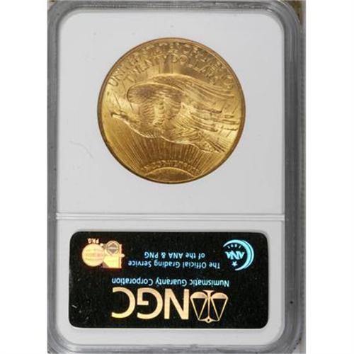 <B>1920 $20 MS63 NGC.</B></I> NGC Census: (1218/328). PCGS Population (1432/482). Mintage: 228,250. Numismedia Wsl. Price for NGC/PCGS coin in MS63: $885. (#9170)<BR><BR><B>Coin Engraver:</B> Augustus Saint-Gaudens<BR><BR><b>Shipping:</b> Coins & Currency (<a target="_blank" href="http://www.heritageauctions.com/common/shipping.php">view shipping information</a>)