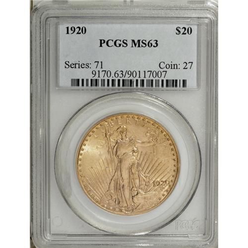 <B>1920 $20 MS63 PCGS.</B></I> A rich yellow-gold example, attentively struck with strong luster. The fields are lightly abraded, and an indentation is noted on Liberty's exposed shin.<BR><BR><b>Shipping:</b> Coin/Currency (<a target="_blank" href="http://www.heritageauctions.com/common/shipping.php">view shipping information</a>)