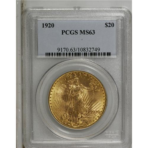 <B>1920 $20 MS63 PCGS.</B></I> A satiny orange-gold example that is well struck overall. Both sides are lightly abraded, and several parallel marks are noted to the left of the eagle's beak.<BR><BR><b>Shipping:</b> Coin/Currency (<a target="_blank" href="http://www.heritageauctions.com/common/shipping.php">view shipping information</a>)