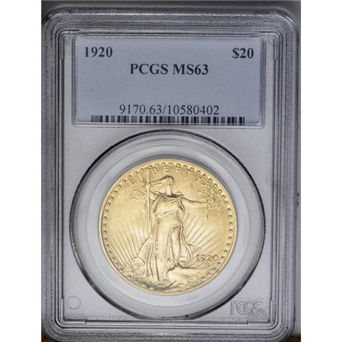 1920 $20 MS63 PCGS. Bright and lustrous, with rich ton 1920