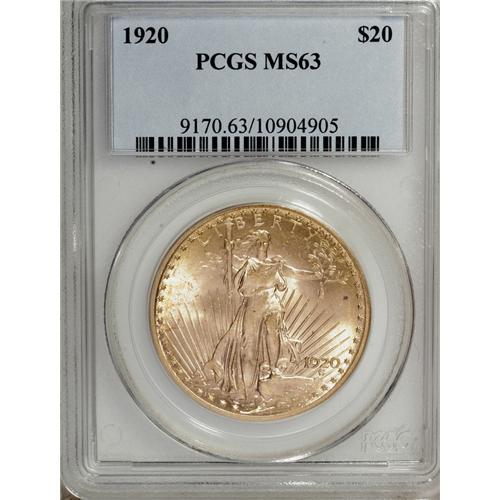 <B>1920 $20 MS63 PCGS.</B></I> Bright luster bathes this moderately abraded and boldly struck postwar twenty. Liberty's chest and knee have honey patina. The 1920 has a lower mintage than the notoriously rare 1921.<BR><BR><b>Shipping:</b> Coins & Currency (<a target="_blank" href="http://www.heritageauctions.com/common/shipping.php">view shipping information</a>)