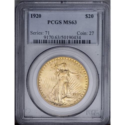 <B>1920<$20> MS63 PCGS.</B></I> Frosty and richly toned, this boldly struck example could easily qualify for a finer grade, based upon its flashy, highly lustrous appearance. A moderate number of small to moderate abrasions keep it at the MS63 level, however. This is one of the better P-mint dates in the Saint-Gaudens series.<BR><I>From The Alexander Collection, Part Two.</B></I> <BR><BR><B>Important notice:</B> Heritage usually auctions material at the rate of 200-250 lots per hour. On some occasions eBay Live bid software or the Internet may not be able to keep up with the pace of the auction. We recommend placing a realistic absentee bid now as insurance to avoid disappointment. Occasionally the auctioneer may eliminate or reject an eBay Live bid, and the auctioneer may also reopen a lot after the close of the eBay live bidding (usually because we missed an audience bid), and may reject your bid even if it shows you as the winning bidder. By bidding via eBay Live, you agree that Heritage may award the lot to another bidder at its sole discretion under the circumstances described above or any other reasonable circumstances. Since eBay bids are not shown to us until we open the lot on the floor, we treat those bids just like floor bids. In most cases the floor responds before the eBay bid is presented to us, due to Internet lag time, so for consistency we have made it a policy that floor bids are always considered first over tie eBay live bids. Also please note that all Heritage lots purchased through eBay Live carry a 20% Buyer's Premium. Please make sure you read the Terms and Conditions before you bid. This lot is being auctioned in conjunction with a live floor auction by Heritage Galleries & Auctioneers. All final auction and invoice information will be supplied by Heritage Galleries & Auctioneers, and all other information should be considered preliminary. Lot:4661 <BR><BR><B>Winning Notification and Billing:</B> After the FINAL session in this auction is complete, Heritage will send e-mail and snail mail invoices. This process normally takes several days. All final auction and invoice information will be supplied by Heritage Galleries & Auctioneers, and all other information should be considered preliminary. <BR><BR>This auction will be conducted on a live auction floor and over the Internet through eBay Live. If you choose to place an absentee bid, please take a moment to <font color='#0000ff'><u><a href='http://pages.ebay.com/liveauctions/help/before/laabsentee.html'>learn how eBay Live absentee bidding works</a></u></font><font color='#000000'>