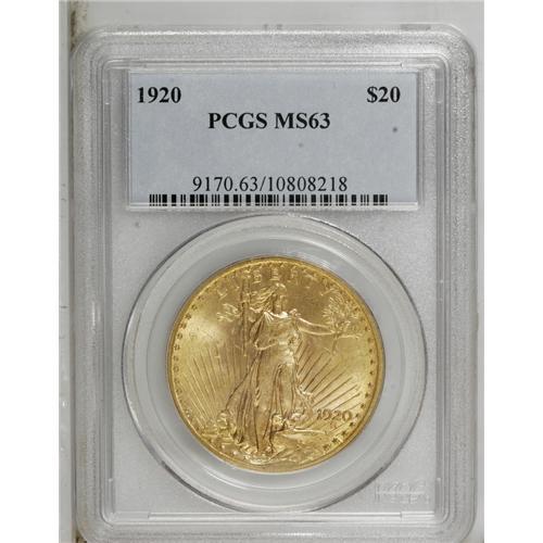 1920 $20 MS63 PCGS. Nicely struck overall, though Libe