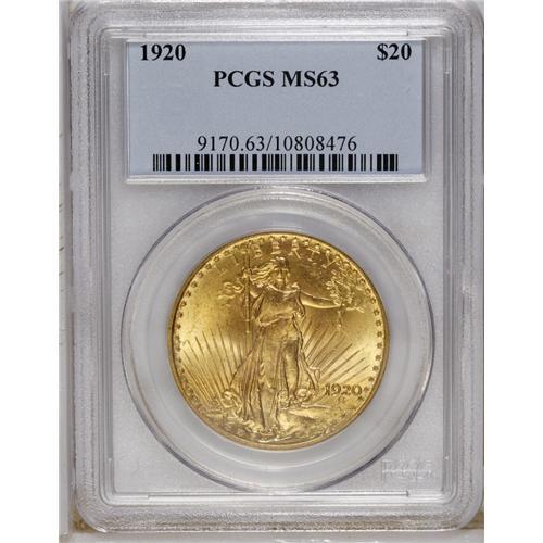 <B>1920 $20 MS63 PCGS.</B></I> Select with highly lustrous surfaces that possess a brassy cast. The well struck devices have few marks, though the fields are lightly abraded.<BR><BR><b>Shipping:</b> Coin/Currency (<a target="_blank" href="http://www.heritageauctions.com/common/shipping.php">view shipping information</a>)