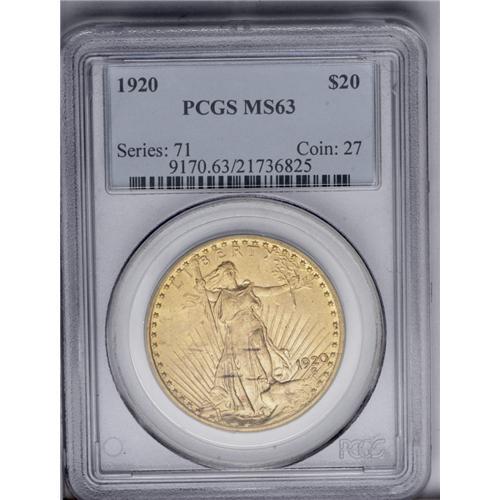 1920 $20 MS63 PCGS. The surfaces are lustrous and copp 1920[$20] MS63 PCGS.