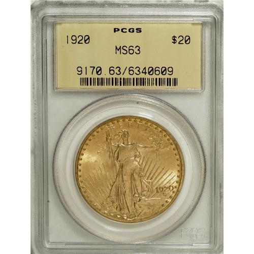 <B>1920 $20 MS63 PCGS.</B></I> The yellow-gold surfaces are awash in satiny luster. The strike is generally bold, if somewhat soft on the Capitol building and on Liberty's torch hand. The number of scattered surface blemishes seems smaller than average for the Select grade level.<BR><BR><b>Shipping:</b> Coins & Currency (<a target="_blank" href="http://www.heritageauctions.com/common/shipping.php">view shipping information</a>)