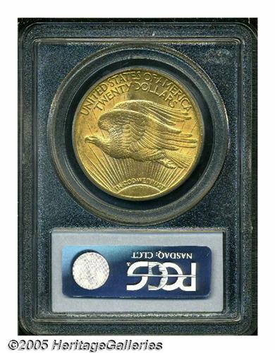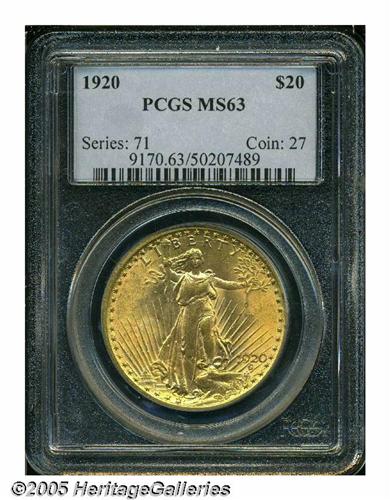 <B>1920<$20> MS63 PCGS.</B></I> This is one of the better dates in the Saint-Gaudens series. The present example displays radiant luster and attractive peach-gold patina. The design elements reveal nice definition, except that some weakness is apparent on the Capitol Building. The few grade-limiting marks that are present are not worthy of individual mention.