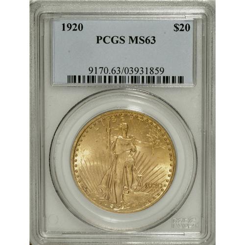 <B>1920 $20 MS63 PCGS.</B></I> Though the 1920 is a lower-mintage issue at just 228,250 pieces, it commands little (if any) premium over type, which makes it a bargain for savvy collectors. The glowing orange-gold surfaces of this well-defined double eagle have a few light, yet grade-defining abrasions.<BR><BR><b>Shipping:</b> Coins & Currency (<a target="_blank" href="http://www.heritageauctions.com/common/shipping.php">view shipping information</a>)