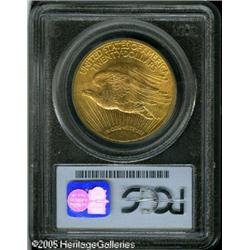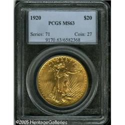<B>1920 $20 MS63 PCGS.</B></I> Well struck with full, frosty luster, rich orange-gold color, and a few moderate blemishes that limit the coin's grade. Lot:9596