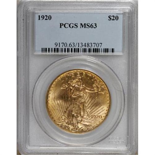 <B>1920 $20 MS63 PCGS.</B></I> PCGS Population (1406/462). NGC Census: (1208/326). Mintage: 228,250. Numismedia Wsl. Price for NGC/PCGS coin in MS63: $885. (#9170)<BR><BR><B>Coin Engraver:</B> Augustus Saint-Gaudens<BR><BR><b>Shipping:</b> Coins & Currency (<a target="_blank" href="http://www.heritageauctions.com/common/shipping.php">view shipping information</a>)