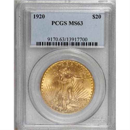 <B>1920 $20 MS63 PCGS.</B></I> Well struck with strongly lustrous, lightly abraded wheat-gold surfaces that show faint elements of green. An appealing Select survivor from this issue of just 228,250 pieces.<BR><BR><B>Coin Engraver:</B> Augustus Saint-Gaudens<BR><BR><b>Shipping:</b> Coins & Currency (<a target="_blank" href="http://www.heritageauctions.com/common/shipping.php">view shipping information</a>)