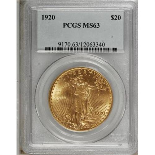 <B>1920 $20 MS63 PCGS.</B></I> A lovely example with frosty yellow luster. This date is generally considered common, but it is much harder to locate than P-Mint coins from later in the decade.<BR><BR><B>Coin Engraver:</B> Augustus Saint-Gaudens<BR><BR><b>Shipping:</b> Coins & Currency (<a target="_blank" href="http://www.heritageauctions.com/common/shipping.php">view shipping information</a>)