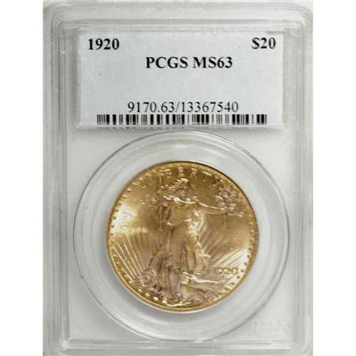 <B>1920 $20 MS63 PCGS.</B></I> PCGS Population (1504/505). NGC Census: (1239/336). Mintage: 228,250. Numismedia Wsl. Price for NGC/PCGS coin in MS63: $885. (#9170)<BR><BR><B>Coin Engraver:</B> Augustus Saint-Gaudens<BR><BR><b>Shipping:</b> Coins & Currency (<a target="_blank" href="http://www.heritageauctions.com/common/shipping.php">view shipping information</a>)