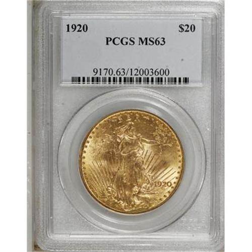 <B>1920 $20 MS63 PCGS.</B></I> . PCGS Population (1543/524). NGC Census: (1261/347). Mintage: 228,250. Numismedia Wsl. Price for NGC/PCGS coin in MS63: $1,060. (#9170)<BR><BR><B>Coin Engraver:</B> Augustus Saint-Gaudens<BR><BR><b>Shipping:</b> Coins & Currency (<a target="_blank" href="http://www.heritageauctions.com/common/shipping.php">view shipping information</a>)